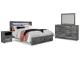- Includes king panel storage bed (headboard, footboard, rails and roll slats), dresser with mirror, and nightstand
