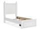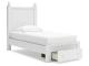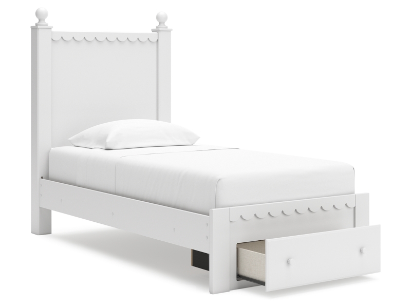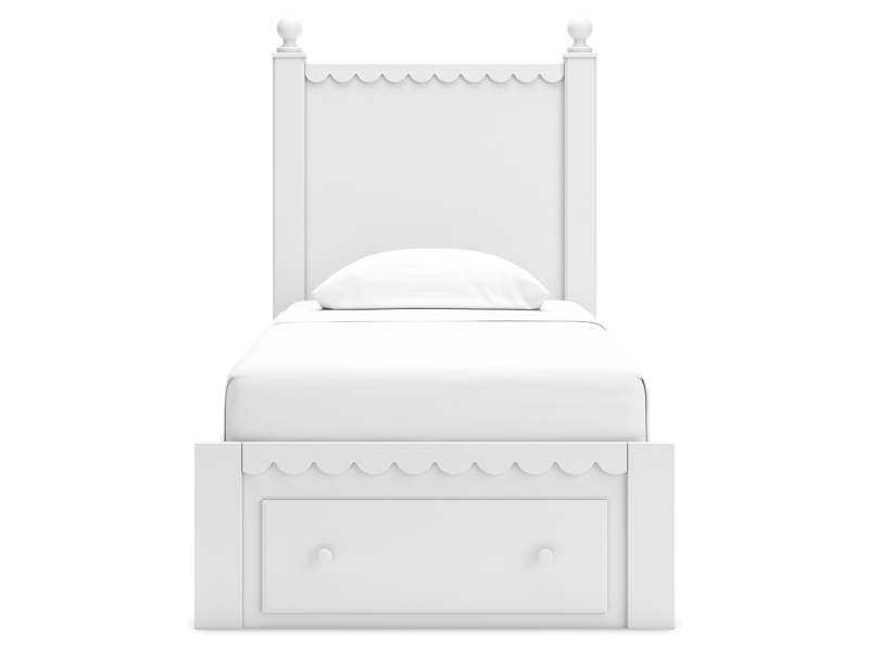 Make morning or bedtime that much more magical with this twin panel storage bed. Charmingly cute with its scalloped detailing, it appeals to both her sense of playful whimsy and your love for modern design. Drawers in the footboard provide handy storage for clothes, toys and anything in between. And the bed's crisp white finish gives you the versatility to pair it with existing decor.