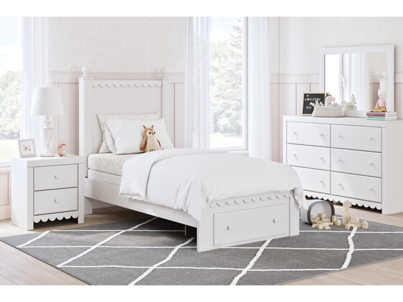 Matte white finish. Cases feature a framed front and pilasters. Bed and cases feature a playful scallop design. Cases accented with simple white knobs. Beds feature decorative ball tops. Side roller glides for smooth operating drawers. Drawer interiors finished with a replicated linen design. A slim USB charger is located on the back of the nightstand tops. Mirror (36) has the versatility to mount to on the dresser or to the wall both horizontally and vertically. Twin (53) and full (87) headboards can attach to a hook-on metal bed frame B100-21 respectively. All storage footboards (52S,84S) require rails (83,86) respectively. Headboards (53,87) are compatible with all footboard options (52,52S,84,84S) respectively. Mirror (36) has the versatility to be mounted on dresser or wall horizontally or vertically. Safety is a top priority, clothing storage units are designed to meet the most current standard for stability, ASTM F 2057 (ASTM International). Drawers extend out to accommodate maximum access to drawer interior while maintaining safety. Minor assembly required.