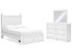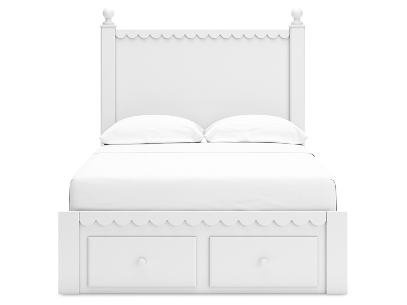 Matte white finish. Cases feature a framed front and pilasters. Bed and cases feature a playful scallop design. Cases accented with simple white knobs. Beds feature decorative ball tops. Side roller glides for smooth operating drawers. Drawer interiors finished with a replicated linen design. A slim USB charger is located on the back of the nightstand tops. Mirror (36) has the versatility to mount to on the dresser or to the wall both horizontally and vertically. Twin (53) and full (87) headboards can attach to a hook-on metal bed frame B100-21 respectively. All storage footboards (52S,84S) require rails (83,86) respectively. Headboards (53,87) are compatible with all footboard options (52,52S,84,84S) respectively. Mirror (36) has the versatility to be mounted on dresser or wall horizontally or vertically. Safety is a top priority, clothing storage units are designed to meet the most current standard for stability, ASTM F 2057 (ASTM International). Drawers extend out to accommodate maximum access to drawer interior while maintaining safety. Minor assembly required.