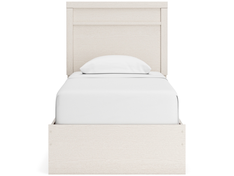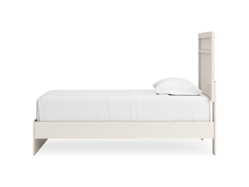 With its clean-lined look and modern attitude, this panel bed is a fresh style awakening. A crisp, white hue over subtle replicated wood grain easily complements other furniture finishes. Its simple, unadorned profile is given depth and dimension with the addition of plank-style moulding on the headboard—proof that beauty lies in the details.