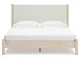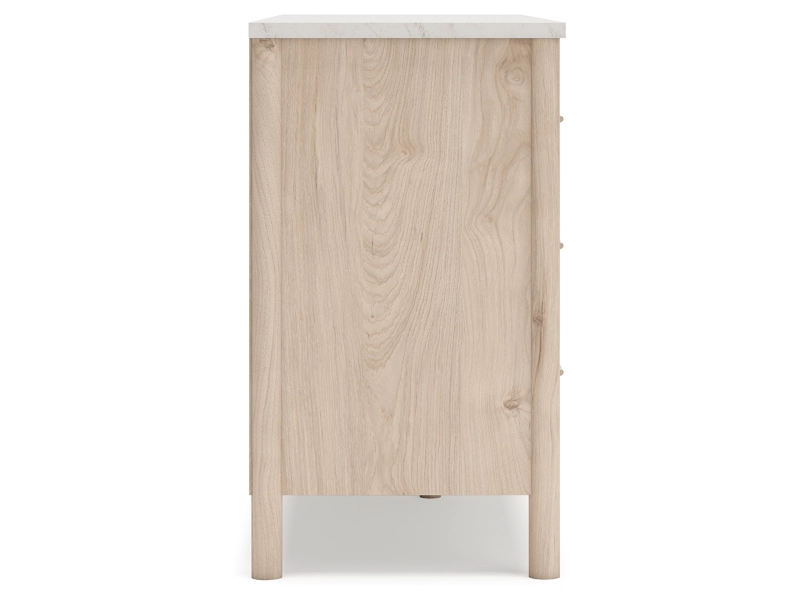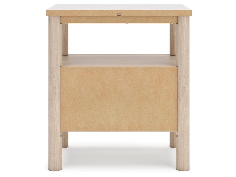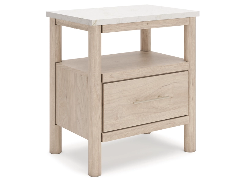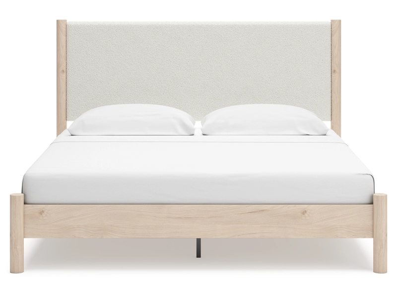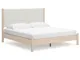 Smooth, light finish with replicated oak grain accented with a replicated white marble top. Beds and cases feature round post leg details. Cases accented with champagne colored finished handles. Side roller glides for smooth operating drawers. Drawer interiors are lined with a replicated linen design for a clean, finished look. Both USB and wireless charging options are provided with the nightstands. Nightstand (91) features ambient lighting under the top. Upholstered headboard options (57,58,87) feature a white textural fabric and wooden vertical posts. Headboards (57,58,87) attached to footboards (54,56,84) respectively. Footboards (54,56,84) require the use of B100-12, B100-13 or the B100-14 roll slats. Safety is a top priority, clothing storage units are designed to meet the most current standard for stability, ASTM F 2057 (ASTM International). Drawers extend out to accommodate maximum access to drawer interior while maintaining safety. Minor assembly required.