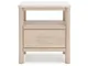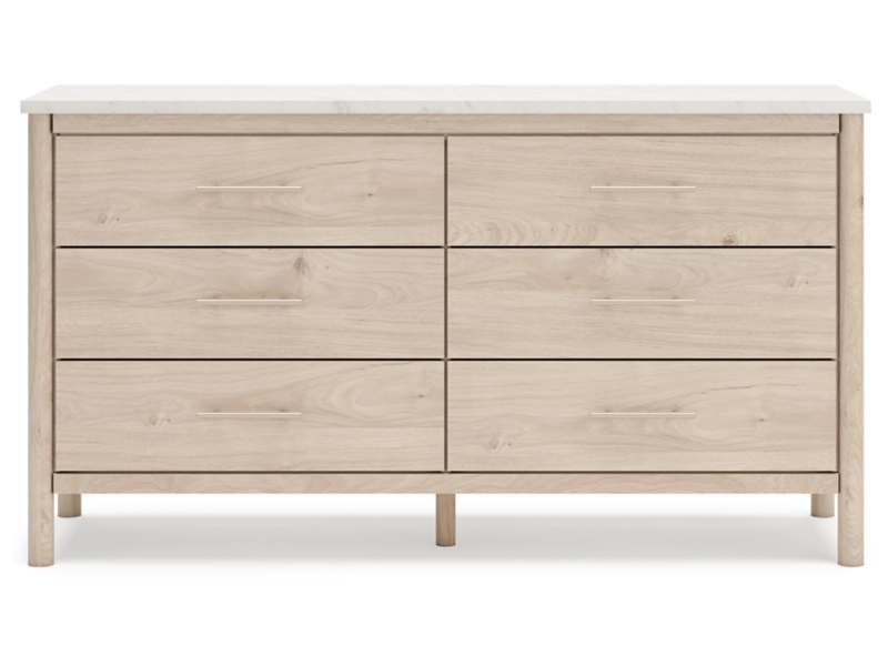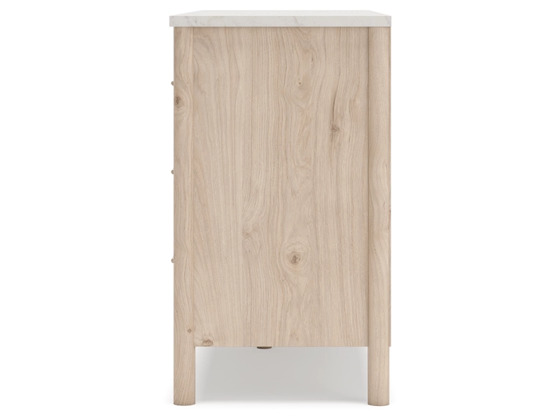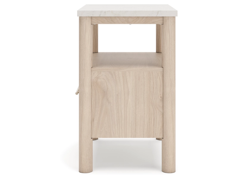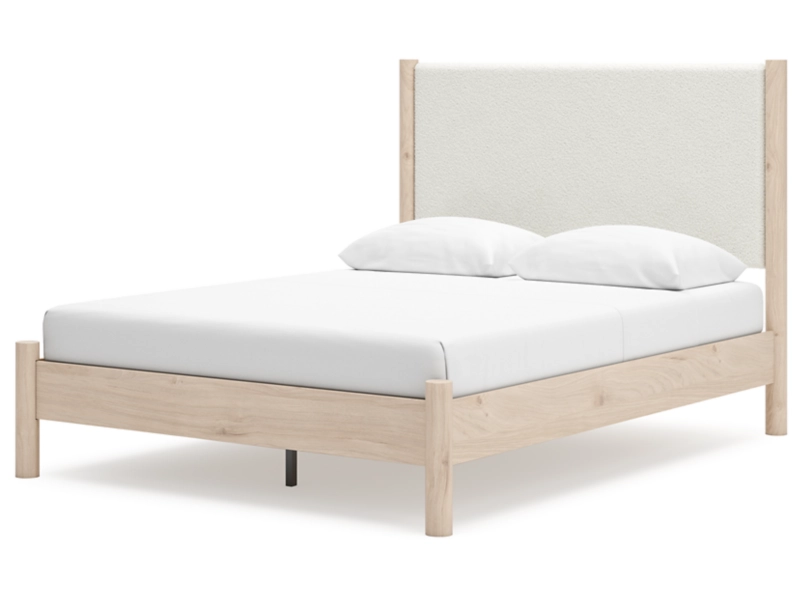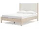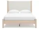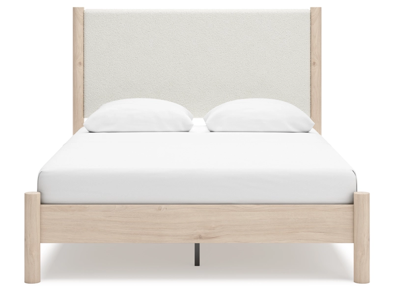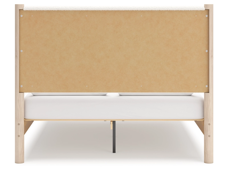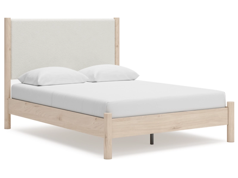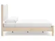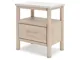 Smooth, light finish with replicated oak grain accented with a replicated white marble top. Beds and cases feature round post leg details. Cases accented with champagne colored finished handles. Side roller glides for smooth operating drawers. Drawer interiors are lined with a replicated linen design for a clean, finished look. Both USB and wireless charging options are provided with the nightstands. Nightstand (91) features ambient lighting under the top. Upholstered headboard options (57,58,87) feature a white textural fabric and wooden vertical posts. Headboards (57,58,87) attached to footboards (54,56,84) respectively. Footboards (54,56,84) require the use of B100-12, B100-13 or the B100-14 roll slats. Safety is a top priority, clothing storage units are designed to meet the most current standard for stability, ASTM F 2057 (ASTM International). Drawers extend out to accommodate maximum access to drawer interior while maintaining safety. Minor assembly required.
