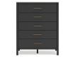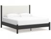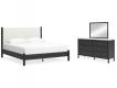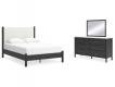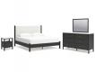 Matte black finish with subtle replicated wood grain accented with a replicated white marble top. Beds and cases feature round post leg details. Cases accented with light bronze colored finished handles. Side roller glides for smooth operating drawers. Drawer interiors are lined with a replicated linen design for a clean, finished look. Both USB and wireless charging options are provided with the nightstands. Nightstand (91) features ambient lighting under the top. Upholstered headboard options (57,58,87) feature a white textural fabric and wooden vertical posts. Headboards (57,58,87) attached to footboards (54,56,84) respectively. Footboards (54,56,84) require the use of B100-12, B100-13 or the B100-14 roll slats. Black upholstered bed full (72), queen (81), king (82) do not require additional foundation/box spring; accommodates most zero clearance adjustable bases. Safety is a top priority, clothing storage units are designed to meet the most current standard for stability, ASTM F 2057 (ASTM International). Drawers extend out to accommodate maximum access to drawer interior while maintaining safety. Minor assembly required.