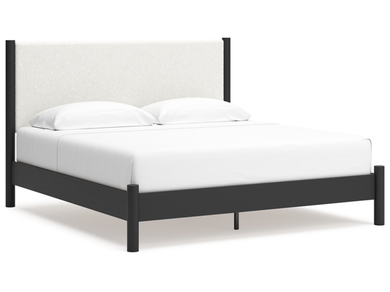 This king upholstered panel bed reflects your sophisticated approach to boho style. Crafted with both form and function in mind, its fresh white fabric beautifully contrasts the matte black finish. The versatile design suits all-neutral spaces or blends with your favorite pops of color. It’s inviting, yet posh. Luxe, yet laid-back. With this bed, your free-spirited vibe meets modern design.