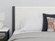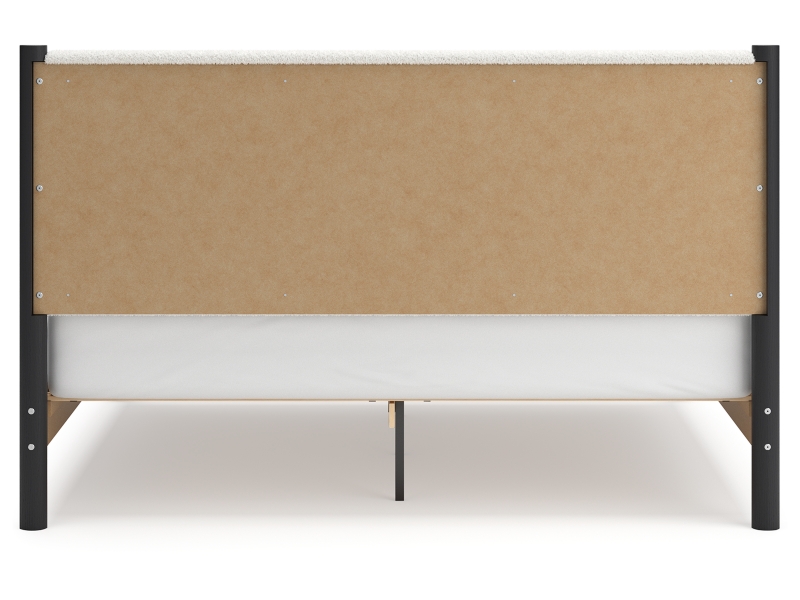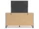 Matte black finish with subtle replicated wood grain accented with a replicated white marble top. Beds and cases feature round post leg details. Cases accented with light bronze colored finished handles. Side roller glides for smooth operating drawers. Drawer interiors are lined with a replicated linen design for a clean, finished look. Both USB and wireless charging options are provided with the nightstands. Nightstand (91) features ambient lighting under the top. Upholstered headboard options (57,58,87) feature a white textural fabric and wooden vertical posts. Headboards (57,58,87) attached to footboards (54,56,84) respectively. Footboards (54,56,84) require the use of B100-12, B100-13 or the B100-14 roll slats. Black upholstered bed full (72), queen (81), king (82) do not require additional foundation/box spring; accommodates most zero clearance adjustable bases. Safety is a top priority, clothing storage units are designed to meet the most current standard for stability, ASTM F 2057 (ASTM International). Drawers extend out to accommodate maximum access to drawer interior while maintaining safety. Minor assembly required.