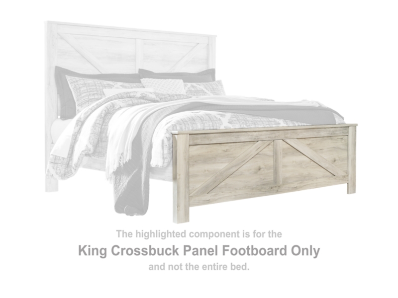 This king crossbuck panel footboard is made with engineered wood (MDF/particleboard/plywood) and decorative laminate. Pairs with other items in the series to make a bed kit.