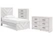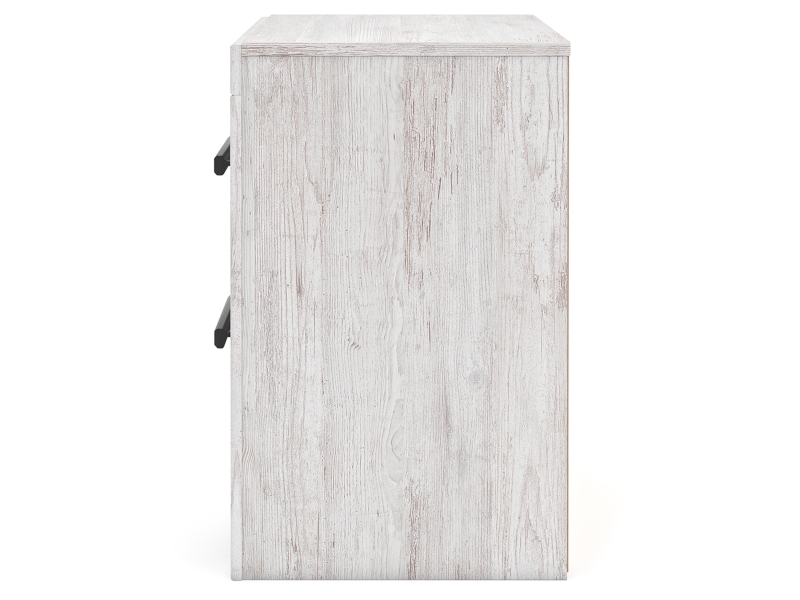Whitewash replicated worn through paint with authentic touch. Cases feature a framed front and pilasters. Large black color handles. Side roller glides for smooth operating drawers. Safety is a top priority, clothing storage units are designed to meet the most current standard for stability, ASTM F 2057 (ASTM International). Drawers extend out to accommodate maximum access to drawer interior while maintaining safety. Minor assembly required.