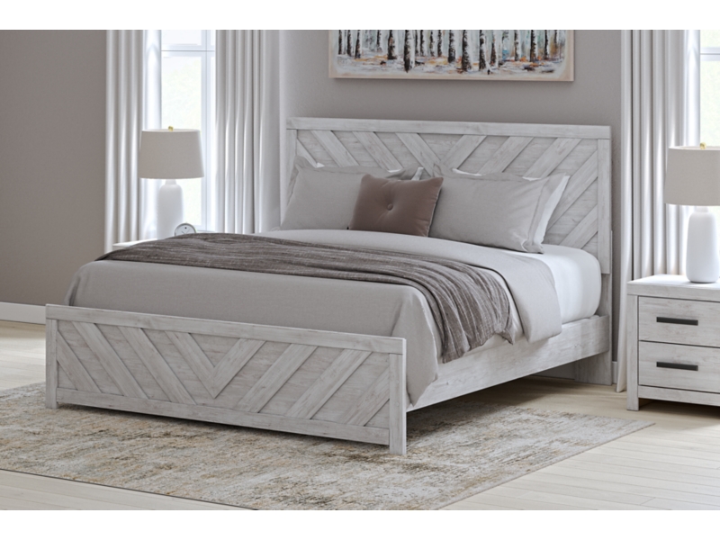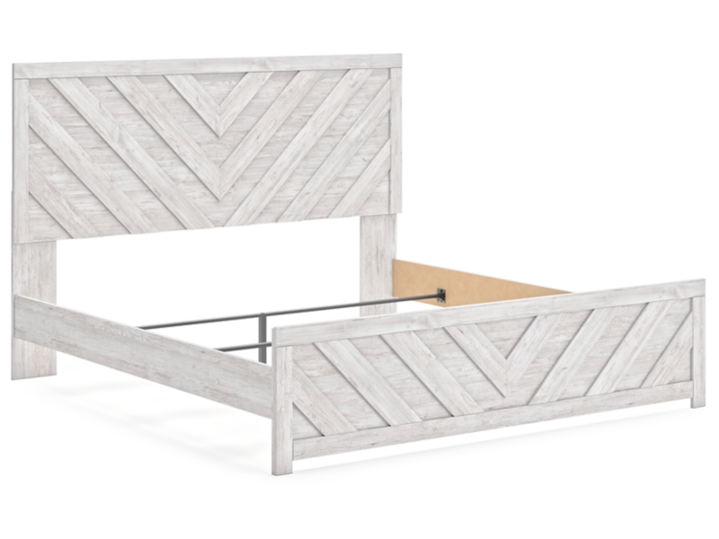 Charmingly designed, this king panel bed embraces the aesthetics of countryside living and repurposes them for modern settings. Its whitewash paint, replicating the wear and tear of time, appeals to your love of vintage character. And a chic chevron pattern on the headboard and footboard keeps your bedroom effortlessly on trend.