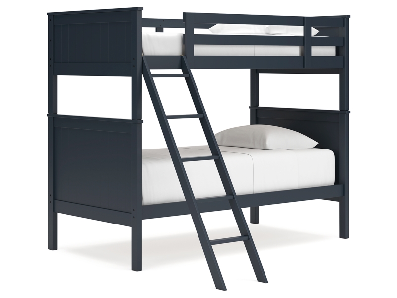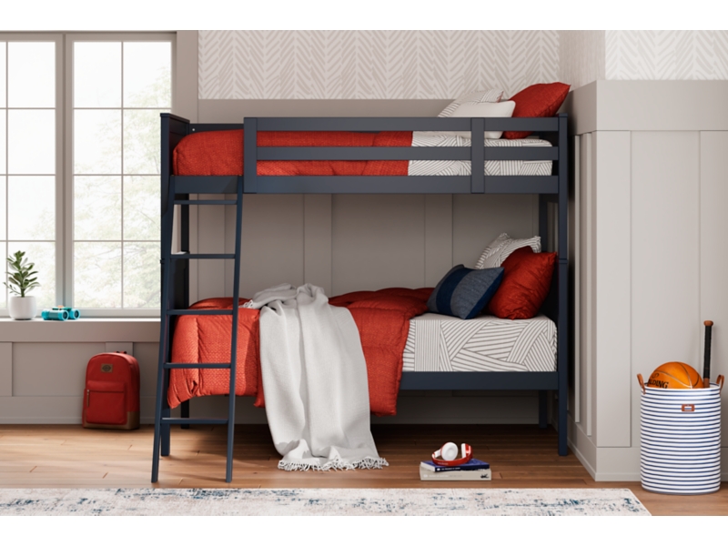 Maximize space and turn your kids' bedtime into an adventure with this cool twin-over-twin bunk bed with mattress set. It's an effortless addition to any bedroom, with a timeless Shaker style that's wonderfully finished in an on-trend blue. Guard rails on the top bunk help everyone get a good night's rest. And the simplified design means easy assembly. Who doesn’t like that?