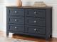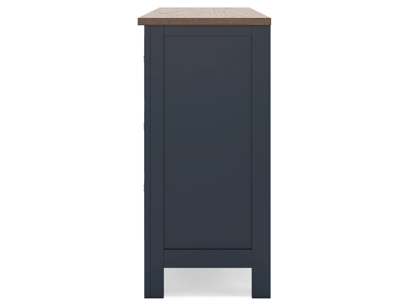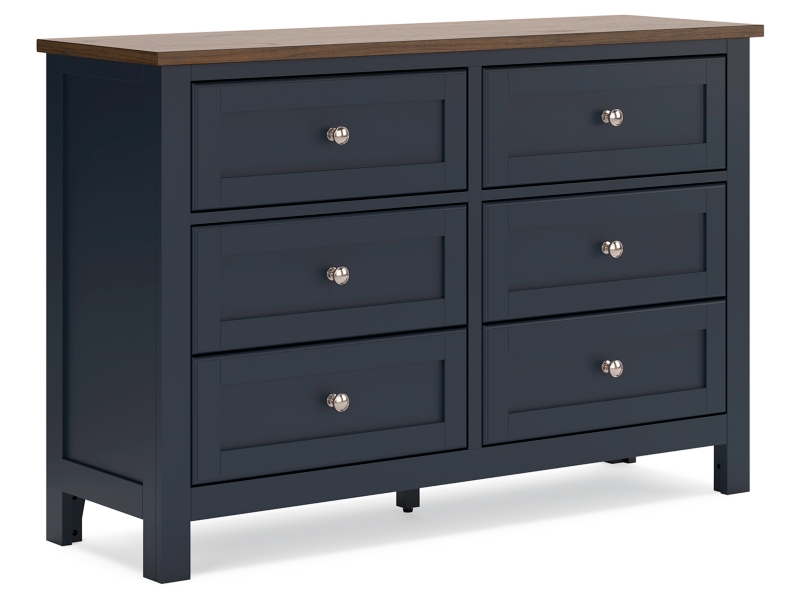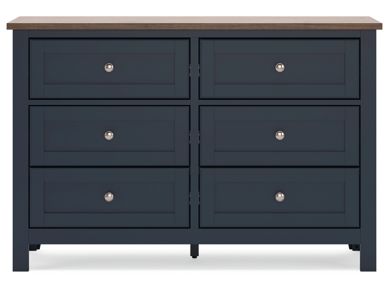 Add homespun charm to your restful retreat. A modern take on a timeless silhouette, this dresser pairs a dark slate blue finish with a light brown top. Drawer fronts and legs in a classic Shaker style bring an air of beautiful simplicity to the bedroom. Whether it's part of a charmingly curated guest suite or a casually carefree kids room, this dresser is a welcome addition.