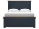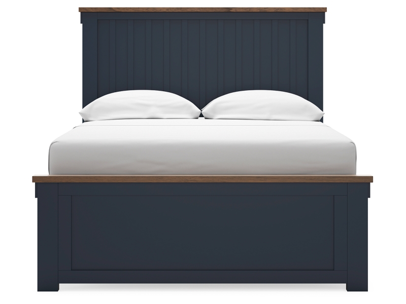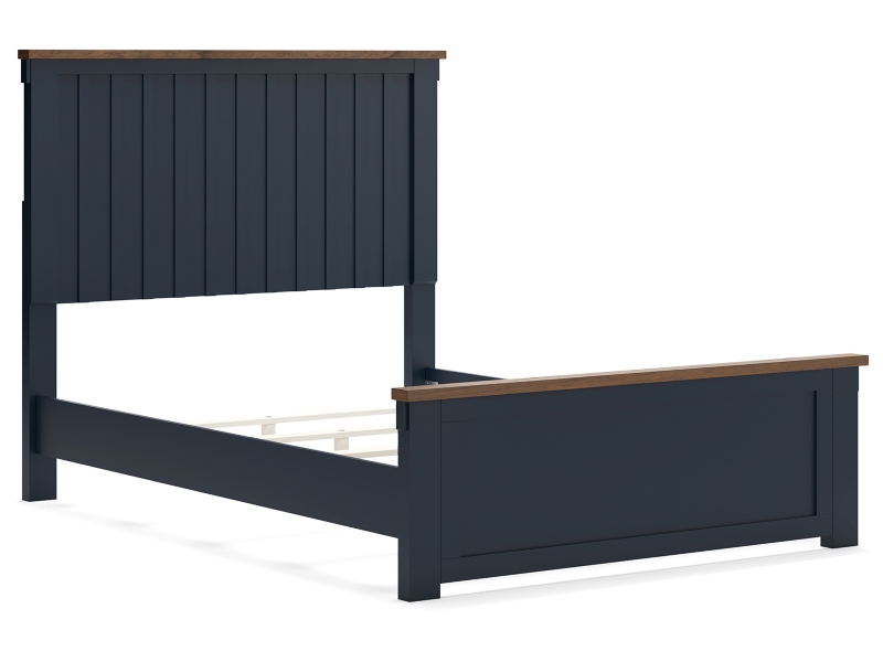Casual lifestyle design. Made with hardwood solids, Mindi wood veneer, and MDF substrates. Two-tone finish features a dark slate blue with light brown wood tone tops. Cases feature timeless Shaker styled legs and drawer fronts with nickel colored metal knobs. Drawers made with dovetailed construction, fully finished interiors and heavy duty ball-bearing side glides. A stylish panel bed with Shaker inspired slat headboard and standard panel footboard.