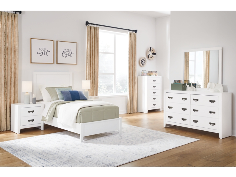 Casual Contemporary design. Made with hardwood solids, Okoume veneer, and MDF substrates. Clean white finished cases with contrasting dark hardware. Drawers feature English dovetail construction, a clean wood grain laminate interior and metal center guides. Cases offer a clean-lined silhouette with planked effects on drawer fronts. Contemporary panel bed with matching planked effects on headboard and footboard.