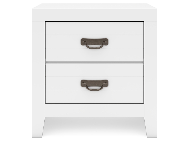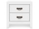 Casual Contemporary design. Made with hardwood solids, Okoume veneer, and MDF substrates. Clean white finished cases with contrasting dark hardware. Drawers feature English dovetail construction, a clean wood grain laminate interior and metal center guides. Cases offer a clean-lined silhouette with planked effects on drawer fronts. Contemporary panel bed with matching planked effects on headboard and footboard.