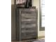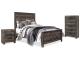 Rustic gray planked replicated oak grain with authentic touch. Large scaled dark colored hooded pull. Sticks across headboard give a thick planked look. Side roller glides for smooth operating drawers. Cases feature a framed front and pilasters. Large drawers provide ample storage space. Slim profile dual USB charger located on the back of the night stand tops. Queen (67) and king (68) poster headboards feature an upholstered panel with horizontal channel details. King poster bed requires the use of the king poster headboard posts (62). Large scaled bed option (54,56,57,58) with a cross-buck design. The queen (98) rails work with both (64,54) footboards. The king (99) rails work with both (66,56) footboards. Headboard and footboard option (53,55) with a cross-buck design. Safety is a top priority, clothing storage units are designed to meet the most current standard for stability, ASTM F 2057 (ASTM International). Drawers extend out to accommodate maximum access to drawer interior while maintaining safety.