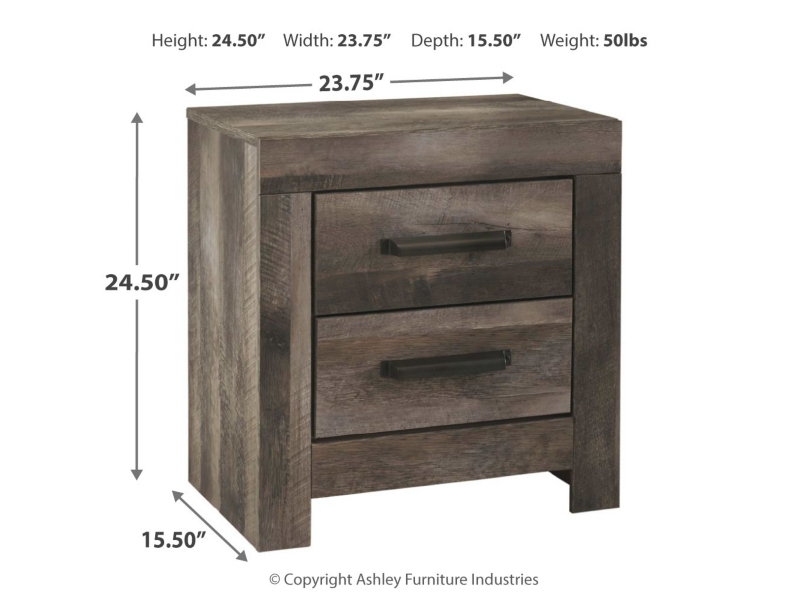 Rustic gray planked replicated oak grain with authentic touch. Large scaled dark colored hooded pull. Sticks across headboard give a thick planked look. Side roller glides for smooth operating drawers. Cases feature a framed front and pilasters. Large drawers provide ample storage space. Slim profile dual USB charger located on the back of the night stand tops. Queen (67) and king (68) poster headboards feature an upholstered panel with horizontal channel details. King poster bed requires the use of the king poster headboard posts (62). Large scaled bed option (54,56,57,58) with a cross-buck design. The queen (98) rails work with both (64,54) footboards. The king (99) rails work with both (66,56) footboards. Headboard and footboard option (53,55) with a cross-buck design. Safety is a top priority, clothing storage units are designed to meet the most current standard for stability, ASTM F 2057 (ASTM International). Drawers extend out to accommodate maximum access to drawer interior while maintaining safety.
