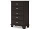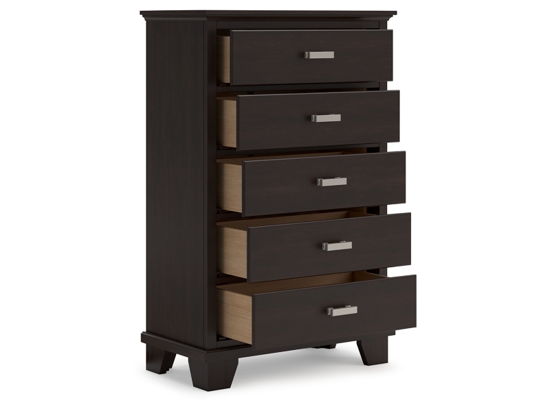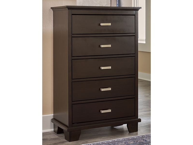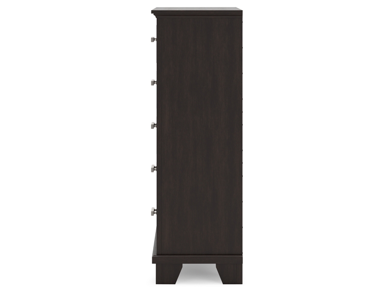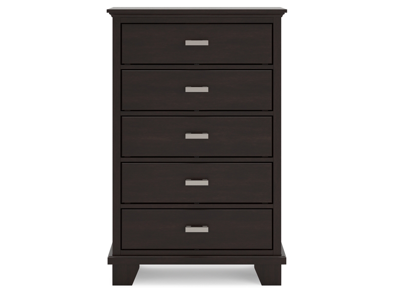 Feast your eyes on this richly versatile chest of drawers. Its traditional-inspired dark brown finish effortlessly blends with contemporary bright nickel-tone pulls to create a stunning look that's not too stuffy or too trendy. Spacious drawers offer plenty of storage for your wardrobe and spare bed linens.