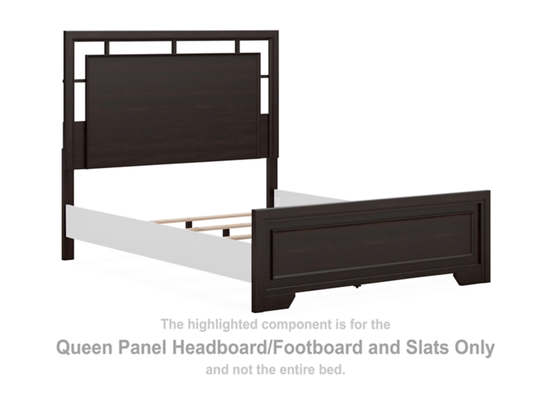 This queen panel headboard, footboard and slats are made with hardwood solids, engineered wood veneer and MDF substrates. Pair with other items in the series to make a bed kit.