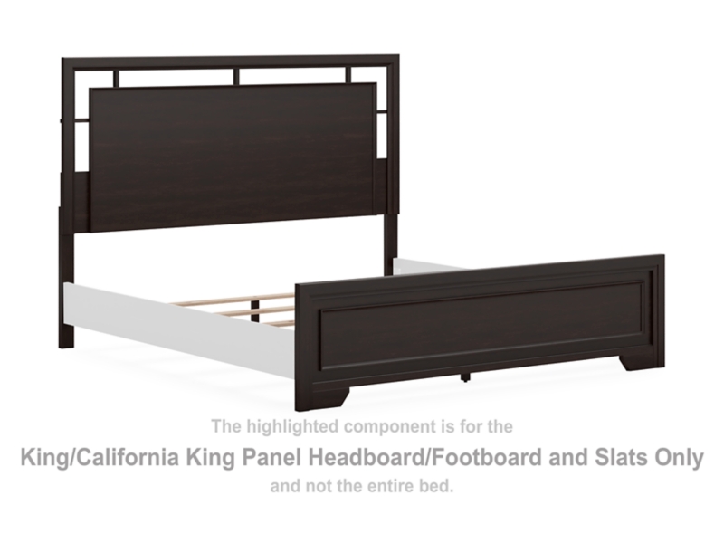 This king/California king panel headboard, footboard and slats are made with hardwood solids, engineered wood veneer and MDF substrates. Pair with other items in the series to make a bed kit.