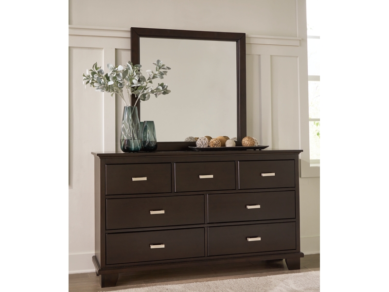 Transitional design. Made with hardwood solids, wood veneer, and MDF substrates. Transitional styled cases with a Metropolitan flare. Drawers feature English dovetail construction, a clean wood grain laminate interior and metal center guides. Metal bar pulls with a bright nickel color finish. Panel bed features a floating headboard panel design with a stylish picture framed footboard.