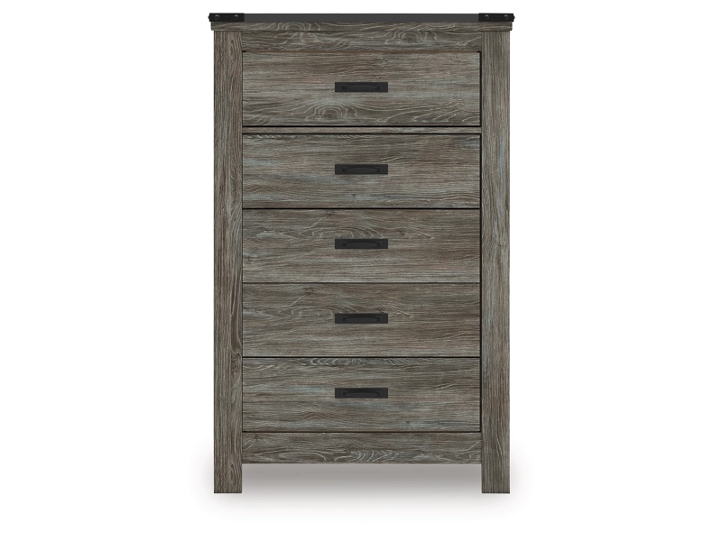 Cool, casual style is for all ages. With this chest of drawers, they get the function they need plus the refined design you love. Approachably neutral in a rustic warm gray, it’s adaptable enough to pair with an assortment of existing colors and room decor. Faux metal detailing on the corners lends an industrial edge. Smooth-gliding drawers offer storage for clothes, toys and everything in between.