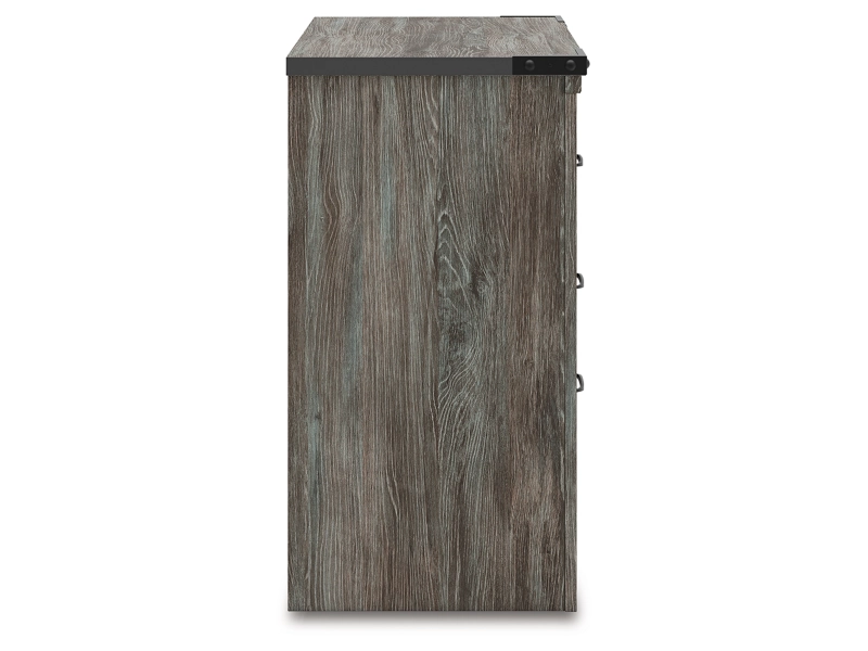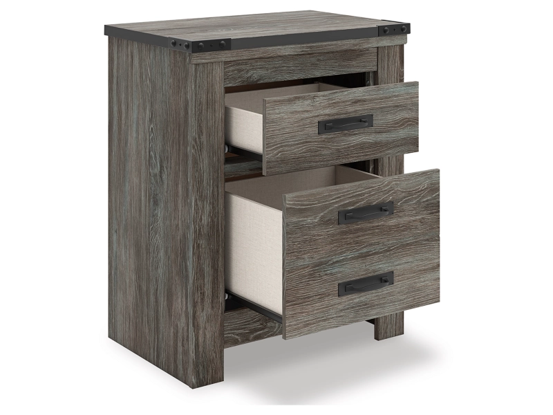 Rustic warm gray finish over replicated Oak grain with authentic touch. Tops of cases and headboard/footboard panels are are finished with faux metal banding and captured with a nail trimmed corner piece. Side roller glides for smooth operating drawers. Handles feature a matte black finish. Slim profile dual USB charger located on the back of the night stand tops. Headboards can attach to bolt-on metal bed frames B100-21, and B100-31 respectively. B100-11, or B100-12 can be used in substitution of a box spring on the twin, or full beds. Safety is a top priority, clothing storage units are designed to meet the most current standard for stability, ASTM F 2057 (ASTM International). Drawers extend out to accommodate maximum access to drawer interior while maintaining safety.