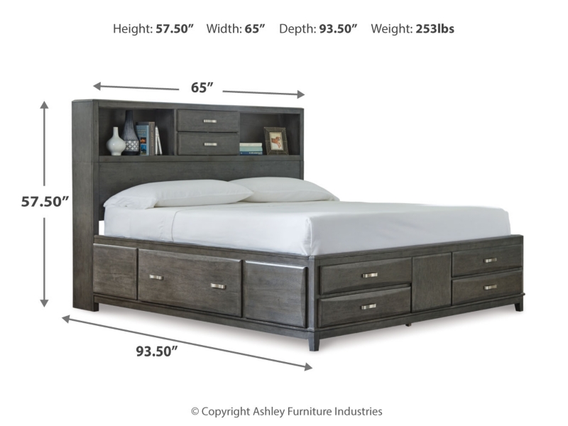 Casual contemporary design. Made with select wood solids, veneers and engineered wood. Contoured drawer fronts with pressed veneer face. Dovetail drawer construction with metal center guides. Stylish metal bar pulls. Captain's style storage bed features a large assortment of drawer storage in the side rails, footboard and headboard. Note full size bed features storage on only one side rail.