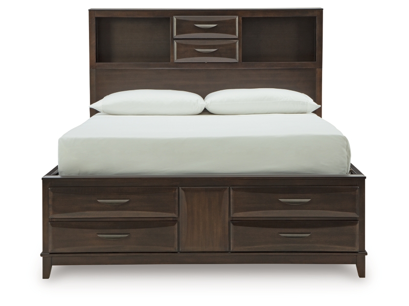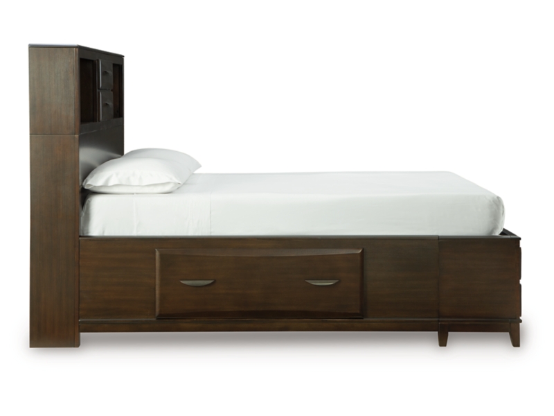 A rich, metropolitan finish. Unbeatable function. With this queen storage bed, it’s a breeze to create a casual contemporary hideaway full of style and convenience. It combines thoughtful craftsmanship and handy storage, with assorted drawers to help you maintain an organized and clutter-free space. Cubbies in the headboard keep bedtime reads close while also acting as the perfect perch for bedroom decor.