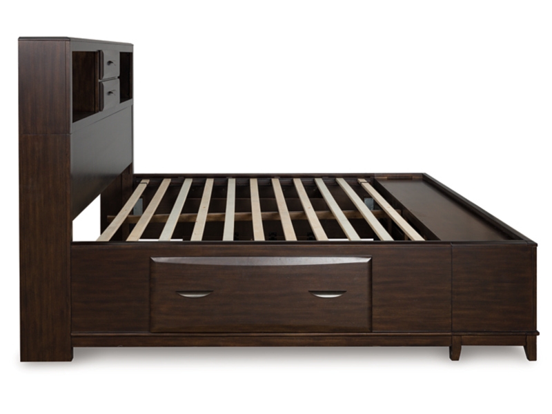 A rich, metropolitan finish. Unbeatable function. With this king storage bed, it’s a breeze to create a casual contemporary hideaway full of style and convenience. It combines thoughtful craftsmanship and handy storage, with assorted drawers to help you maintain an organized and clutter-free space. Cubbies in the headboard keep bedtime reads close while also acting as the perfect perch for bedroom decor.