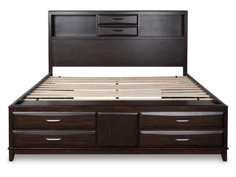 A rich, metropolitan finish. Unbeatable function. With this California king storage bed, it’s a breeze to create a casual contemporary hideaway full of style and convenience. It combines thoughtful craftsmanship and handy storage, with assorted drawers to help you maintain an organized and clutter-free space. Cubbies in the headboard keep bedtime reads close while also acting as the perfect perch for bedroom decor.