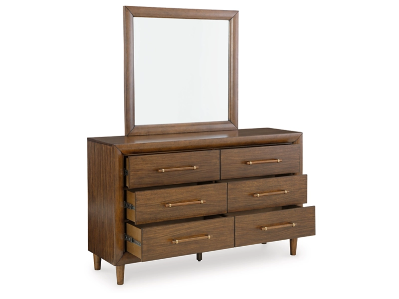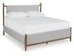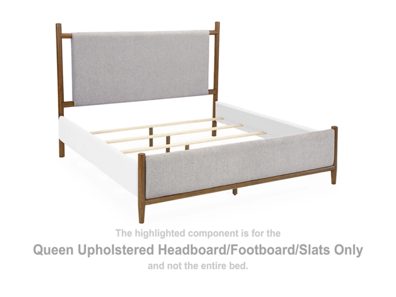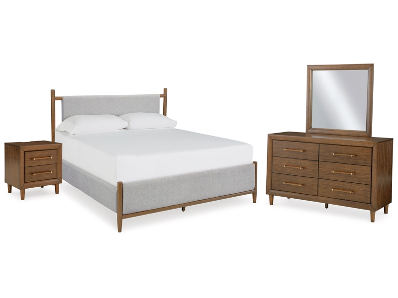 Embrace the allure of contemporary or mid-century interiors with this queen upholstered panel bed. Its versatile, timeless design, featuring a sling-style cushioned headboard, gently cradles your senses. Ready to refresh and redefine your space, this bed is the ideal choice to elevate your bedroom retreat. Dresser, mirror and nightstand included.
