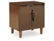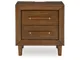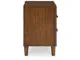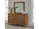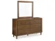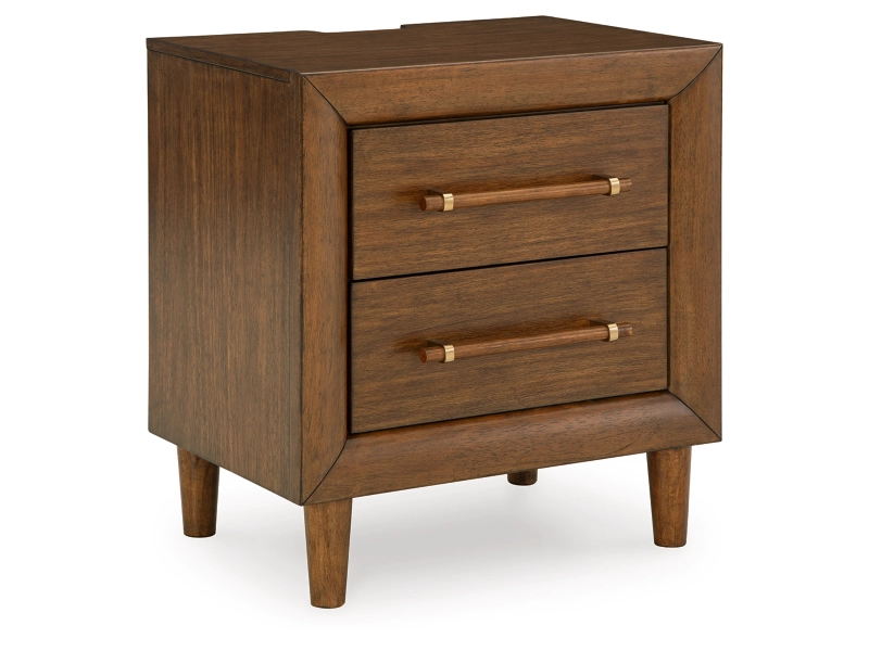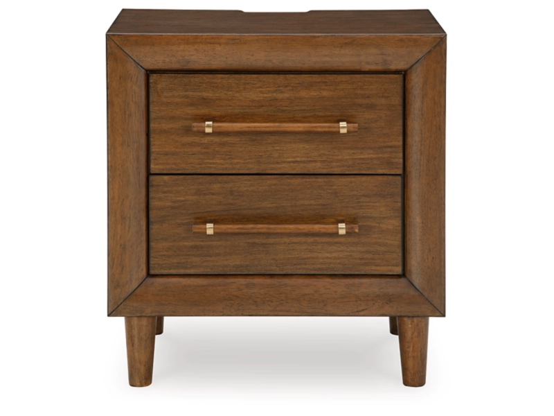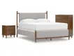 Casual contemporary design. Made with hardwood solids, Mango wood veneer and MDF substrates. Finished in a medium brown natural wood tone. Clean case designs sit on round tapered legs with thick front frames and overlay drawer fronts for added dimension. Drawers feature French/English dovetail construction, fully finished interiors and heavy duty ball-bearing side glides for durability and smooth function. B615-81/-82 stylized poster bed with rounded solid wood frames and a sling style headboard cushion covered with a soft gray fabric. Two drawer nightstand includes a 110V power supply with USB-A and USB-C charging ports.