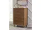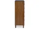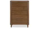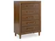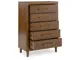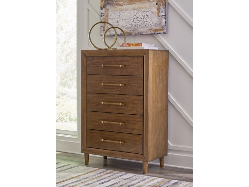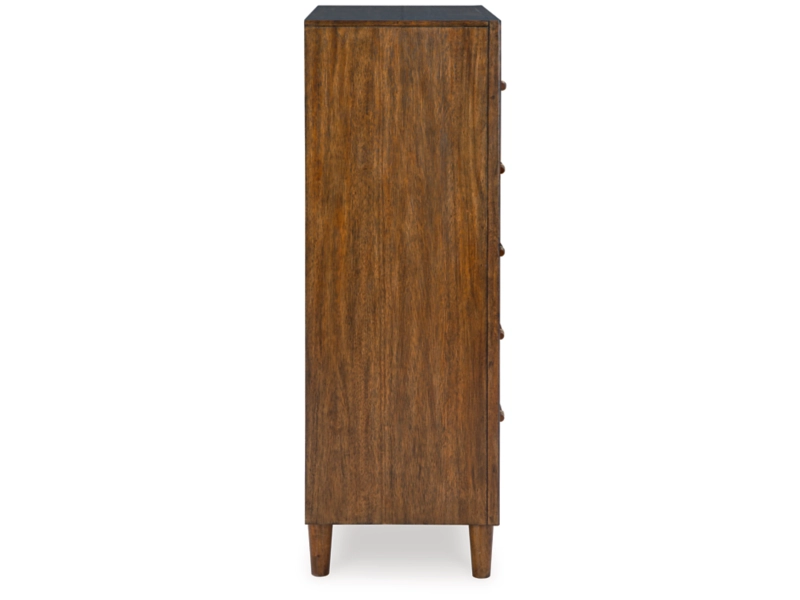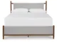 Casual contemporary design. Made with hardwood solids, Mango wood veneer and MDF substrates. Finished in a medium brown natural wood tone. Clean case designs sit on round tapered legs with thick front frames and overlay drawer fronts for added dimension. Drawers feature French/English dovetail construction, fully finished interiors and heavy duty ball-bearing side glides for durability and smooth function. B615-81/-82 stylized poster bed with rounded solid wood frames and a sling style headboard cushion covered with a soft gray fabric. Two drawer nightstand includes a 110V power supply with USB-A and USB-C charging ports.