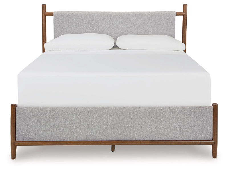 Embrace the allure of contemporary or mid-century interiors with this king upholstered panel bed. Its versatile, timeless design, featuring a sling-style cushioned headboard, gently cradles your senses. Ready to refresh and redefine your space, this bed is the ideal choice to elevate your bedroom retreat. Matching chest and nightstand included.
