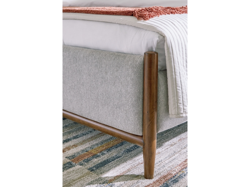 Casual contemporary design. Made with hardwood solids, Mango wood veneer and MDF substrates. Finished in a medium brown natural wood tone. Clean case designs sit on round tapered legs with thick front frames and overlay drawer fronts for added dimension. Drawers feature French/English dovetail construction, fully finished interiors and heavy duty ball-bearing side glides for durability and smooth function. B615-81/-82 stylized poster bed with rounded solid wood frames and a sling style headboard cushion covered with a soft gray fabric. Two drawer nightstand includes a 110V power supply with USB-A and USB-C charging ports.