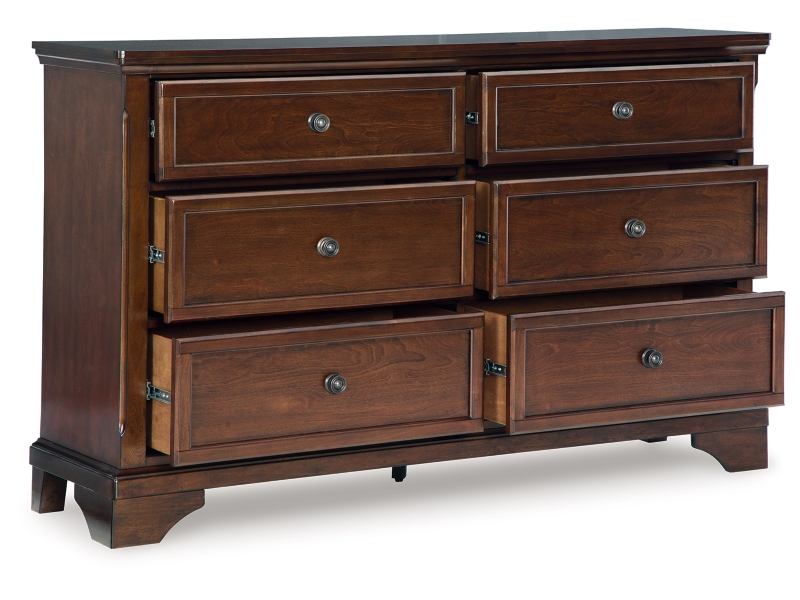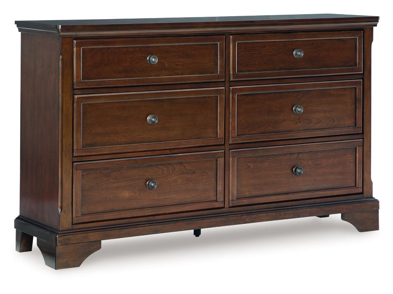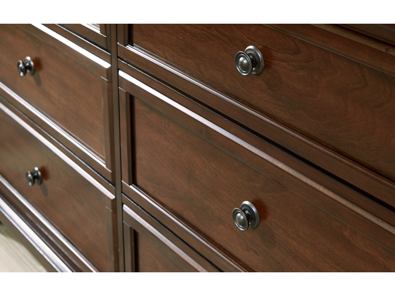 The traditional design of this dresser has a timeless look that adds visual appeal to your bedroom, while its functionalism is equally impressive. There is lots of room for clothes and other essentials in six drawers with a warm brown cherry finish. Creating a beautiful focal point, the drawer fronts are enhanced by round metal knobs in a dark bronze tone for a casual aesthetic.