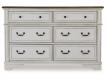 Traditional design with a casual appeal. Made with hardwood solids, MDF substrate and select wood veneer. Casual two-tone finish features chipped white with brown wood-tone tops. Cases offer an ornate sensibility with profiled drawer fronts and pilasters, a waist moulding and traditional hardware finished in a dark bronze coloration. Each drawer is clear sealed with dovetail construction and metal ball-bearing side glides. The bed features an inset upholstered headboard cushion with button tufting. The low-profile side rails and footboard are on-trend for today's casual lifestyles.