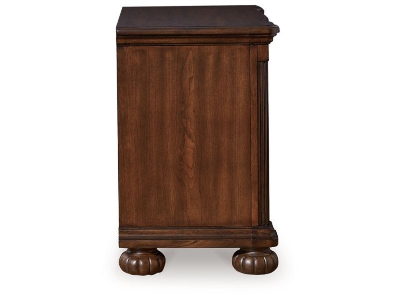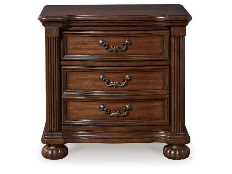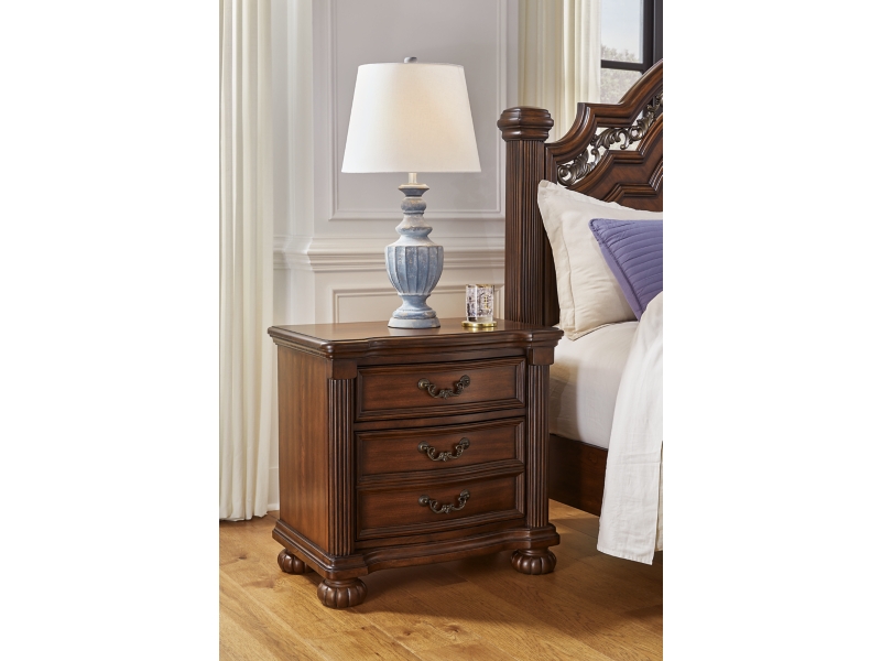 Take inspiration from the traditional luxury of this nightstand. Classic with a rich cherry brown finish, its stately presence graces your room with an air of opulence. Your taste for exquisite details is satisfied with decorative drawer pulls and chic bun feet. And with a hidden pull-out tray for valuables, bedside convenience has never been so refined.