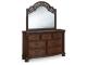 Take inspiration from the traditional luxury of this dresser with mirror. Classic with a rich cherry brown finish, its stately presence graces your room with an air of opulence. Your taste for exquisite details is satisfied with decorative drawer pulls and the mirror's ornate accent filigree. With seven drawers acting as elegant hosts for clothes and other essentials, your restful retreat has never been so refined.