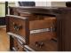 - Decorative metal drawer pulls with dark bronze-tone finish