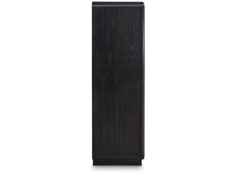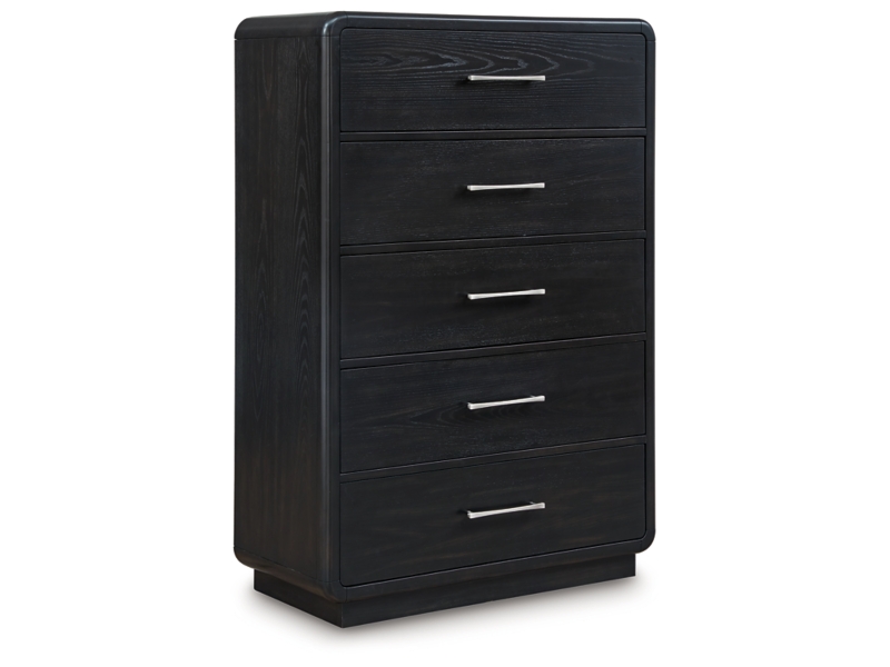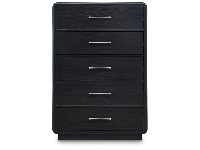 Inspired by art deco design, this softly shaped chest of drawers makes a lasting impression in a simply stunning way. Its magnificent curved silhouette is enhanced by a rich layered black finish on the textured wood grain surface. This is the statement piece you’ve been dreaming of to elevate your contemporary inner sanctum.