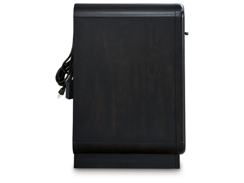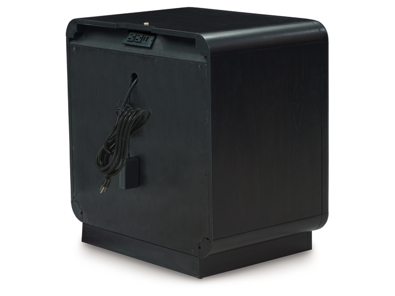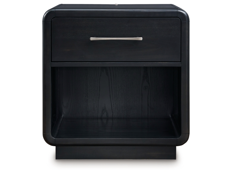 Inspired by art deco design, this softly shaped nightstand makes a lasting impression in a simply stunning way. Its magnificent curved silhouette is enhanced by a rich layered black finish on the textured wood grain surface. Complete with an LED nightlight, AC power and two USB ports, this is the statement piece you’ve been dreaming of to elevate your contemporary inner sanctum.