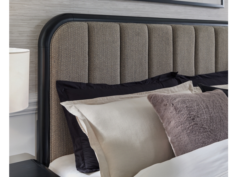 Inspired by art deco design, this softly shaped king upholstered panel bed makes a lasting impression in a simply stunning way. Its magnificent curved silhouette is enhanced by a rich layered black finish on the textured wood grain surface. The channeled vertical headboard and footboard, wrapped in herringbone textured upholstery, merge form and function. This is the statement piece you’ve been dreaming of to elevate your contemporary inner sanctum.