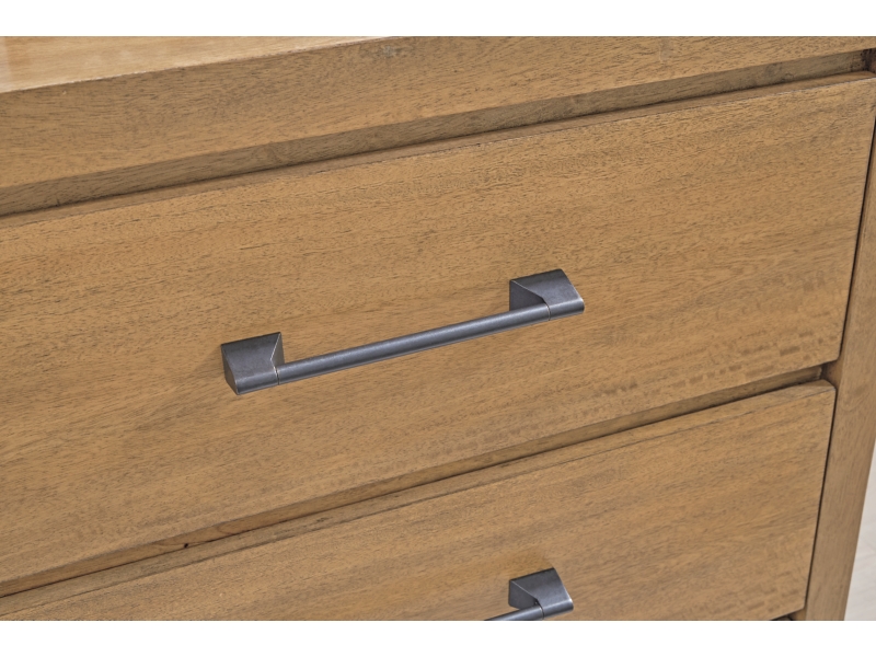 Casual contemporary design. Made with hardwood solids, Mango wood veneer and MDF substrate. Finished in a light wood tone to enhance the rich natural beauty of the wood. Cases feature modern silhouettes with stylish metal drawer pulls in a darkened bronze finish. Drawers have dovetail construction, fully finished interiors and heavy duty ball-bearing side glides for smooth function. A stylish platform bed features a sturdy layback headboard design and dual USB-A, USB-C charging ports conveniently located on each side of the panel. Foundation box spring not required.