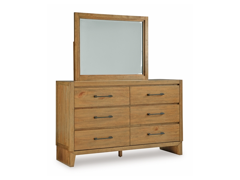 If you appreciate minimalistic style, this dresser and mirror set is the ideal option. Its soft and simple finish has a laid-back sensibility, blending relaxed contemporary design with a trendy allure. The spacious drawers are accented with stylish metal drawer pulls in a darkened bronze tone. What a delightful addition to your casual-chic decor.