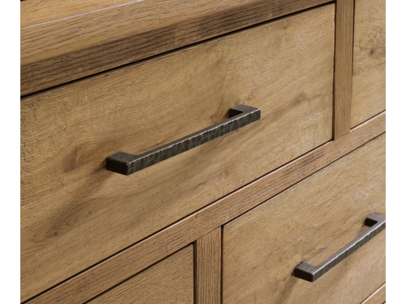 Urban contemporary design with a rustic vibe. Made with hardwood solids, and thick rustic oak veneer. Natural wood may display natural weathering, unique cracks, splits, knots, saw marks or other organic features unique to each piece. Glazed natural light oak color finish enhances the natural characteristics of the veneer. A sturdy panel bed features a rustic design with thick planked lumber look. B841-92 night stand features a composite cement tile inlay and includes a 110V power supply with dual USB charging ports. All drawers feature French/English dovetails with fully finished interiors and ball-bearing side glides. Thick metal bar pulls feature a hammered textural surface in an aged bronze finish.
