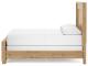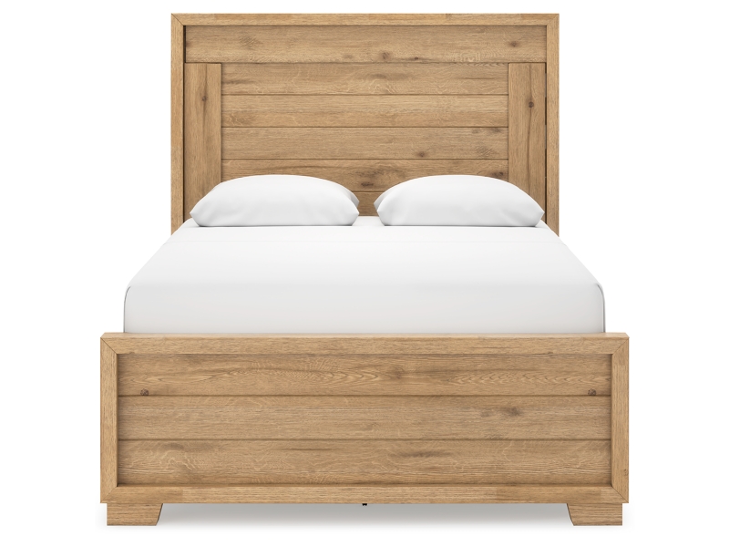 Urban contemporary design with a rustic vibe. Made with hardwood solids, and thick rustic oak veneer. Natural wood may display natural weathering, unique cracks, splits, knots, saw marks or other organic features unique to each piece. Glazed natural light oak color finish enhances the natural characteristics of the veneer. A sturdy panel bed features a rustic design with thick planked lumber look. B841-92 night stand features a composite cement tile inlay and includes a 110V power supply with dual USB charging ports. All drawers feature French/English dovetails with fully finished interiors and ball-bearing side glides. Thick metal bar pulls feature a hammered textural surface in an aged bronze finish.