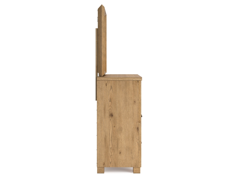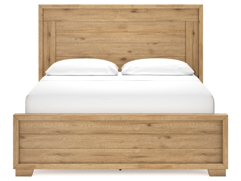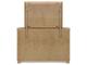 Urban contemporary design with a rustic vibe. Made with hardwood solids, and thick rustic oak veneer. Natural wood may display natural weathering, unique cracks, splits, knots, saw marks or other organic features unique to each piece. Glazed natural light oak color finish enhances the natural characteristics of the veneer. A sturdy panel bed features a rustic design with thick planked lumber look. B841-92 night stand features a composite cement tile inlay and includes a 110V power supply with dual USB charging ports. All drawers feature French/English dovetails with fully finished interiors and ball-bearing side glides. Thick metal bar pulls feature a hammered textural surface in an aged bronze finish.