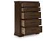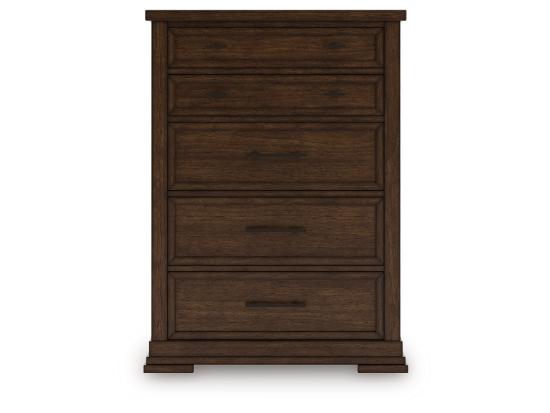 Style, simplicity and charm are hallmarks of this chest of drawers. Created with casual spaces in mind, it has the versatility to suit styles from craftsman to modern farmhouse. The rich brown finish aligns with your refined-meets-relaxed approach to everyday style. And for a timeless touch, five drawers with picture frame detailing accommodate your needs.
