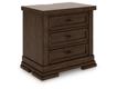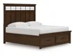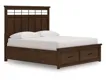 Casual lifestyle design. Made with hardwood solids, Mango wood veneer and MDF substrate. Finished in a rich brown wood tone. Cases feature spacious inset picture framed drawers with fully finished interiors, French/English dovetail construction and heavy duty ball-bearing side glides. Top drawers have black felt bottoms. Stylish modern drawer pulls are finished in a matte black accent color. Panel storage bed features a stylish board and baton effect with an inset metal fret for a modern take on casual design. The storage drawers in the footboard offer extra deep space for storing larger bedroom essentials. Full roll slat foundation for mattress only. No foundation box spring required. Three drawer nightstand includes a 110V power supply with dual USB charging ports.